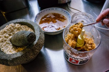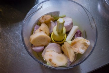 Preparing the rempah (also known as the paste), you need a piece of galangal, ginger, roughly chopped shallots, half a bowl of dried shrimp soaked in hot water, and two teaspoon of curry powder and thoroughly blend.