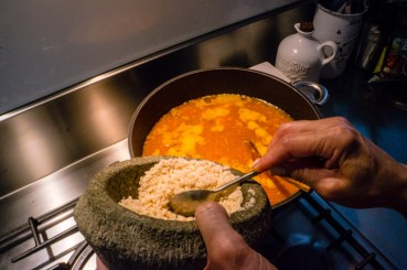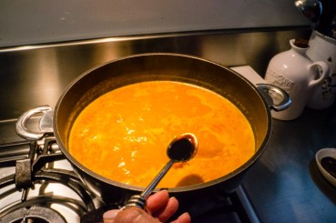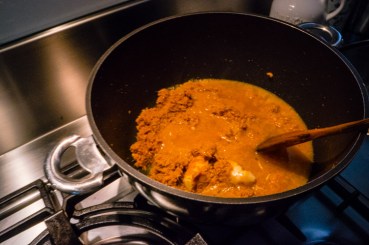 Next step, boil beef strips with cold water, season the water with salt and pepper as well as adding celery sticks. Cut a few sweet potatoes into rough chunks and boil it before forking through the pieces but also making sure it still has chunks. Heat either vegetable or sunflower oil into a large pan on medium heat, constantly stir fry the rempah for 4-5 minutes until fragrant. Pound nuts, add curry powder, sugar and fill the gravy from the beef strips half way of the pan; leaving to simmer on medium-to-low heat for 20 minutes. Season with salt and corn flour to allow broth to thicken.