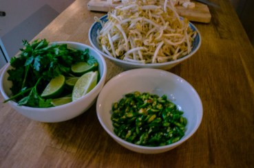 Separately heat oil in a large pan and fry your chopped pieces of tofu over medium-high heat for 4-5 minutes, until golden brown. Remove and drain on some kitchen paper. When it is time to serve yourself, blanch the egg noodles in boiling water then drain well, sprinkle with bean sprouts and pour the gravy over the noodles. Garnish with eggs, tofu, fried shallots, spring onions, coriander, cut celery leaves, fresh green chillies and lime.