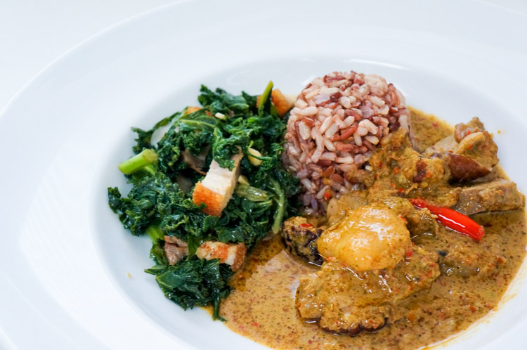 Thoroughly blend the ingredients into a smooth paste, gradually add a little bit of water to allow the paste to easily mix rather than it getting stuck at the bottom of the blender. Preheat your wok in oil on medium to high heat and cook the paste till fragrant, before adding the coconut milk. Season with a chicken stock cube, fish sauce and a little bit of water, lower the heat and leave the curry sauce to simmer for 15-20 minutes. Add the pre-bought duck (I got mine from China town), or you can pan fry skin side down to allow the skin to crisp. Lastly, add the rambutan fruits into the curry with basil leaves. Served with mixed brown and red rice and stir fried kale with pre-bought (from China town) roast pork and pine nuts, seasoned with white pepper and oyster sauce.