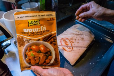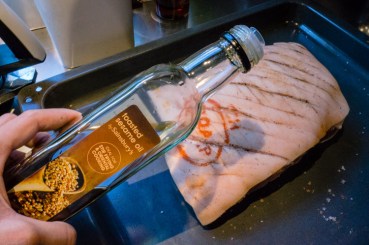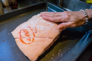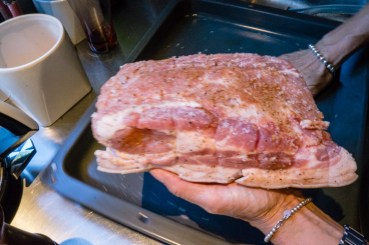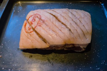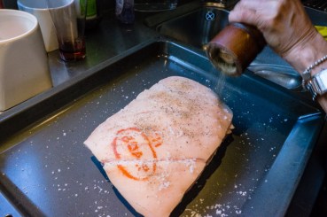 Prep the pork by making sure all the excess liquid on the skin area has been dried off with a good amount of paper towel. With a sharp knife, gently score the skin before rubbing a good handful of rock salt and seasoning it with pepper, five spiced powder, drizzled in sesame oil; do that on both sides of the pork. Put it in the oven on a 240 degrees, visually keep an eye and take it out once the skin has fully crackled and looks golden in colour.