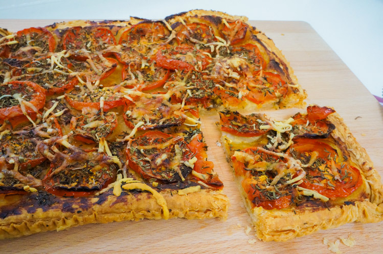Pre-heat the oven to 180degrees. Roll out the ready-made puff pastry that has come out from the fridge and leave aside till it’s room temperature. Cut the pastry to a size you want before lifting the pastry onto a baking sheet. With a fork, press the edges and poke the pastry before brushing olive oil around the edges. Fill the base of the tart with dijon mustard, spread sliced tomatoes and seasoned with salt, pepper, finelly chopped thyme and oregano. Lastly, garnish grated gruyere cheese all over the tart. Place the tart into the oven and bake for 25-30minutes till it becomes golden in colour and the tomatoes are cooked.