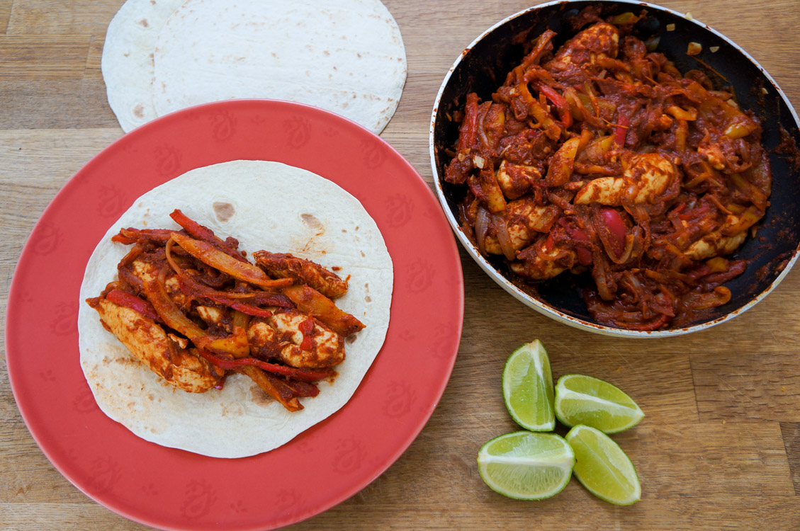 Finely slice the onion, peppers, chop the garlic then leave it aside. Add oil onto your pan and start sweating the onions till soft on medium to low heat. Mix in the peppers and garlic before adding the chicken, cover the pan with a lid and bring the heat to medium to high heat, mix every few minutes. In a bowl, prepare the spiced tomato puree by mixing together the tomato puree, coriander, cumin, paprika, chilli powder, seasoned with salt and pepper. Thoroughly mix the spiced tomato puree into the chicken and peppers. Adjust the seasoning and level of spice (whether you’d like it mild or hot). Once that is down, heat the fajita wraps for a few seconds in the microwave, squeeze a wedge of lime over the fajita wrap and serve right away.