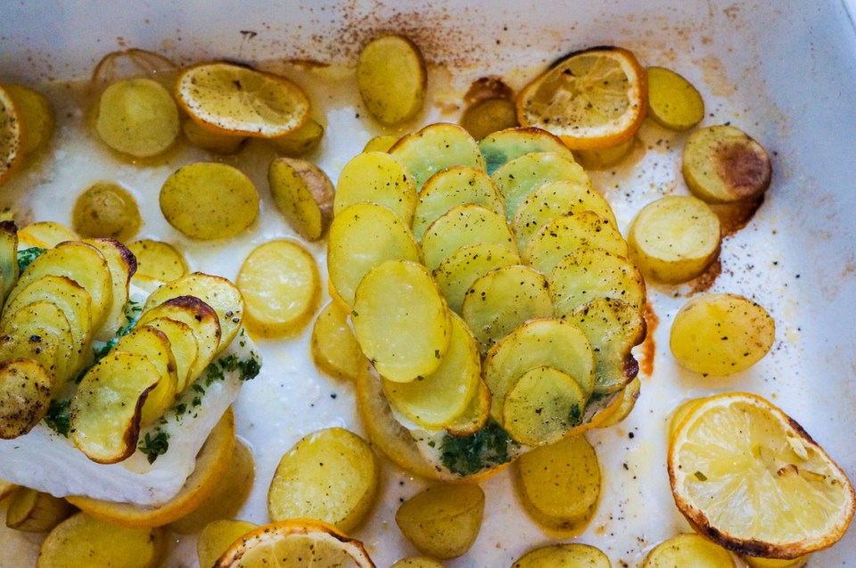 Pre-heat the oven to 180 degrees. Start by thinly slicing or mandoline the potatoes into coin shapes (to prevent it from discolouring, add them into a bowl with cold water and salt till the time you need it), lemons and finely chop the parsley. In a small bowl, mix in the chopped parsley and extra virgin olive oil together and leave it aside. In a baking tray, butter the base and edges before adding halved baby potatoes and lemon slices, oven bake it for 10-13 minutes. On the skin side of the cod, place the lemon slices and gently place it on the potatoes. Brush the cod with parsley and olive oil before dressing the cod with potatoes as fish scales. Brush over the potato scales with some butter before seasoning it with salt and pepper. Oven bake for 15 minutes until fish is cooked through and potatoes are brown and tender. Serve immediately with a side salad of your choice and/or with rice.