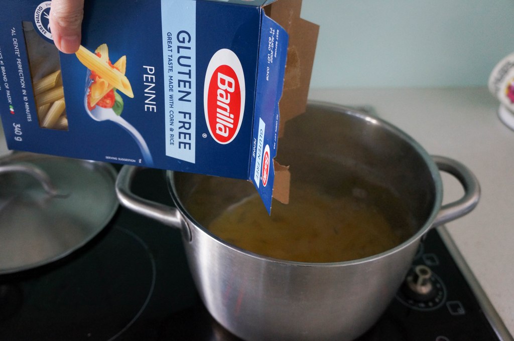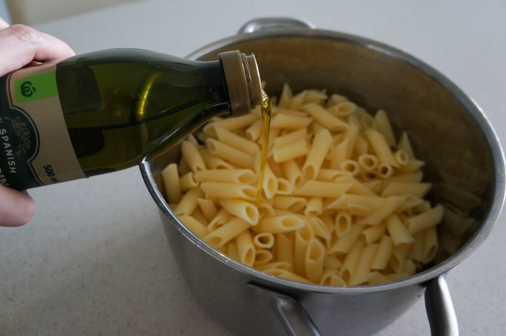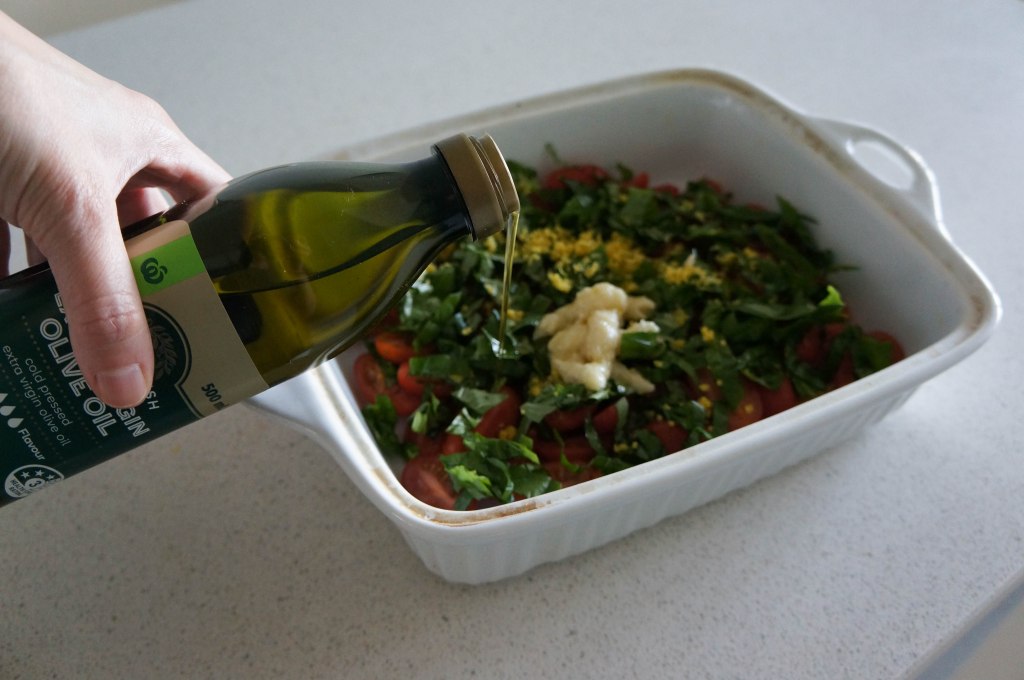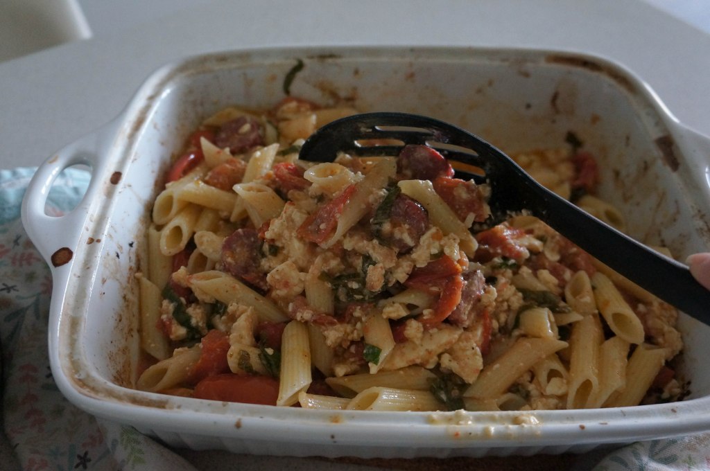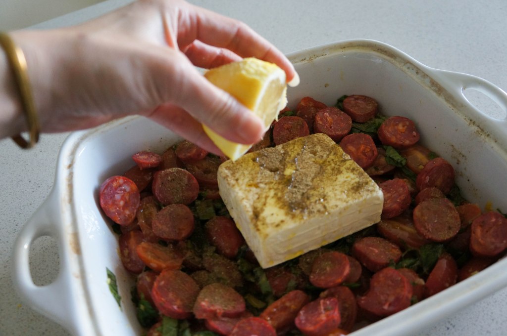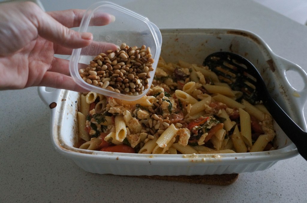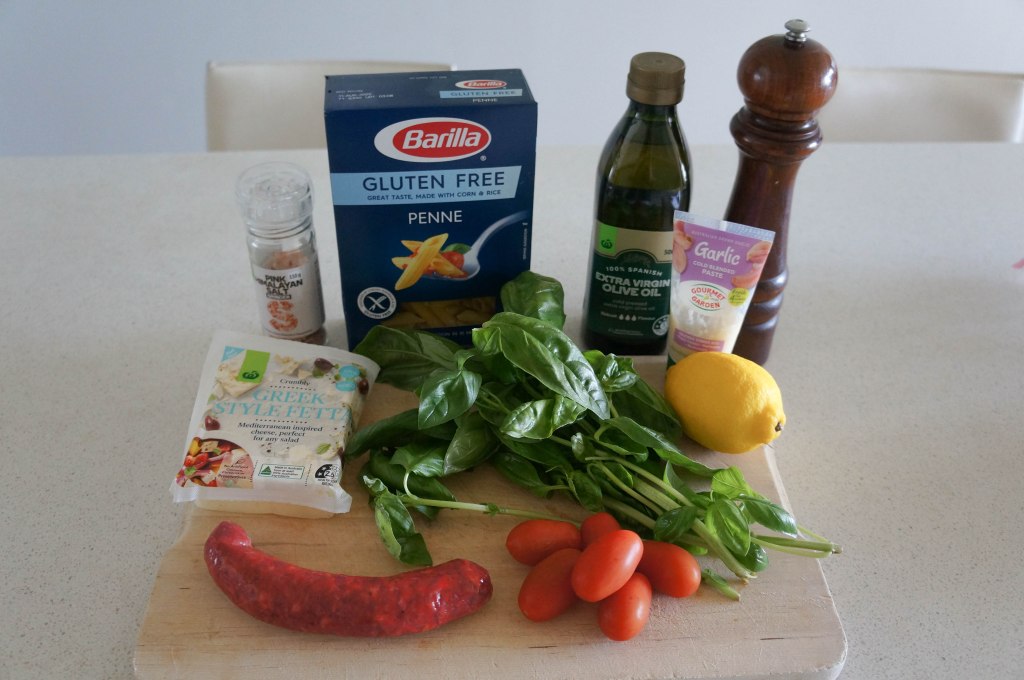 Boil the pasta of your choice with salt and olive oil then drain the water oil and drizzle olive oil and leave aside to cool. Slice the cherry tomatoes and basil before placing in a baking tray. Zest fresh lemon, finely chop garlic, drizzled olive oil, salt, pepper, lemon juice, oregano powder and mix well before placing a block of feta and sliced chorizo into the middle of the baking tray. Oven bake till chorizo is crispy and the cherry tomatoes are softened. Slowly mix the pasta of into the baking tray and taste for seasoning if needed before finishing it off with pine nuts, chilli flakes and parmesan.